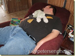 What happens to Daddy when he takes a nap in his chair, Paul covers him in food, toys and books. :)